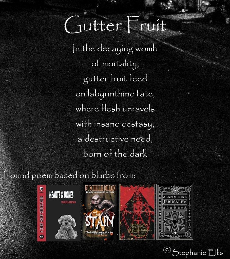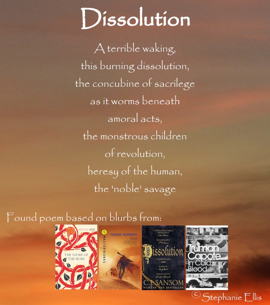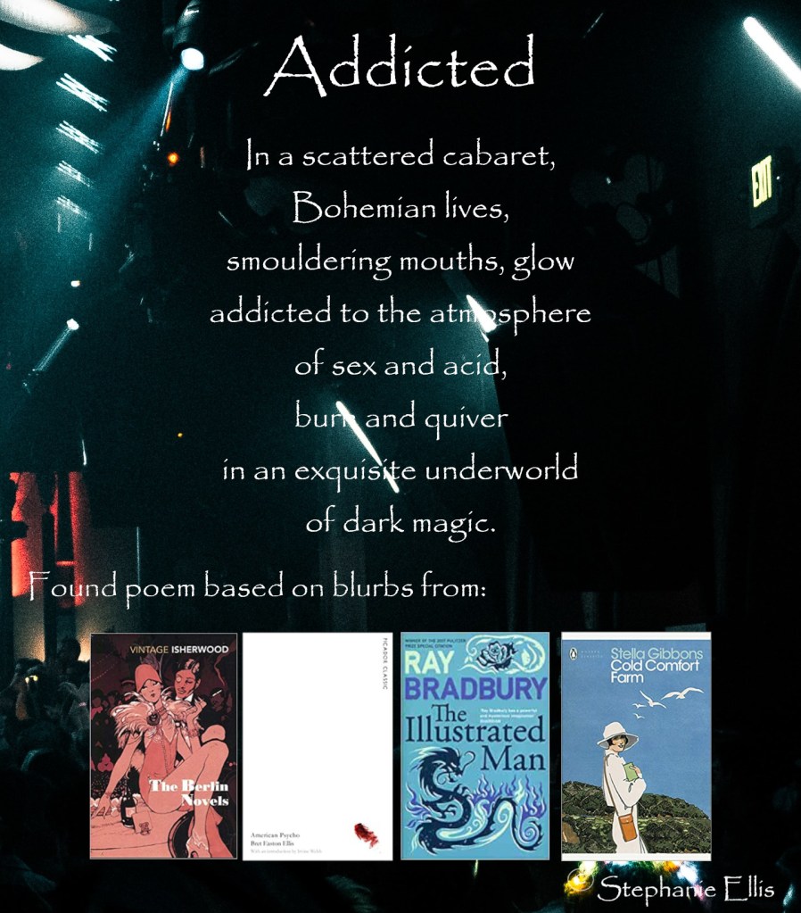 April is National Poetry Month and, never one for sitting back(!), I set myself a challenge of a poem every day. After the first day, I remembered a comment I made to Mike Arnzen last year when I created found poems based on some indie poets’ work. I said I was thinking of creating a found poem from the blurbs of books. Note this is the British context of the blurb being the description on the back of the book – not what I’ve come to realise is regarded as the comment made by another author about said work.