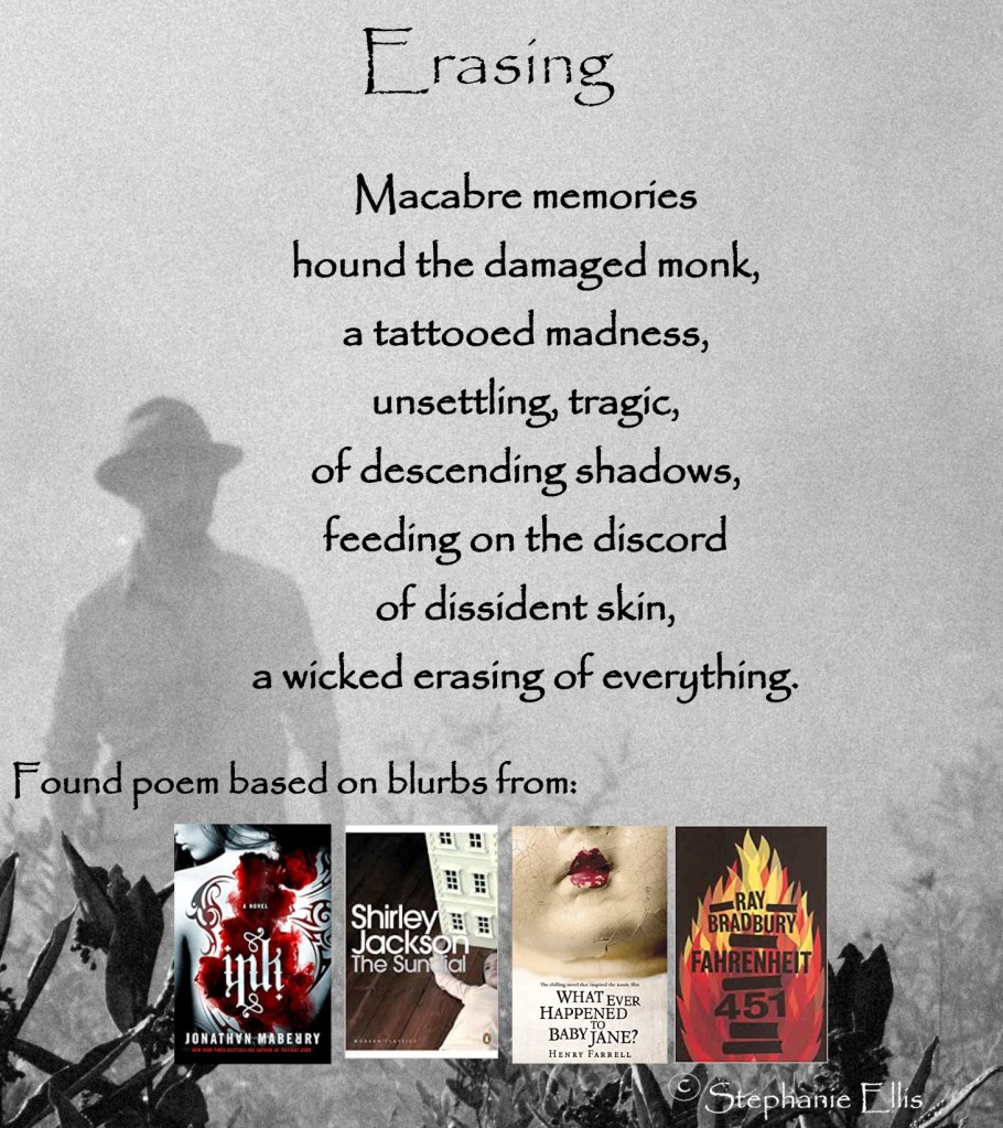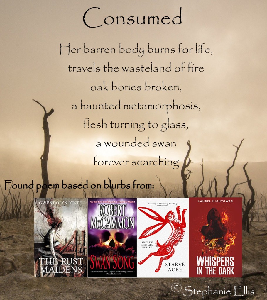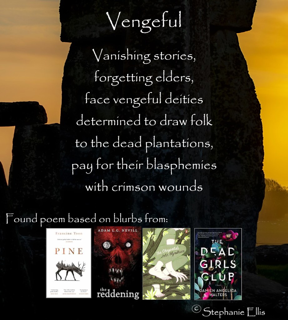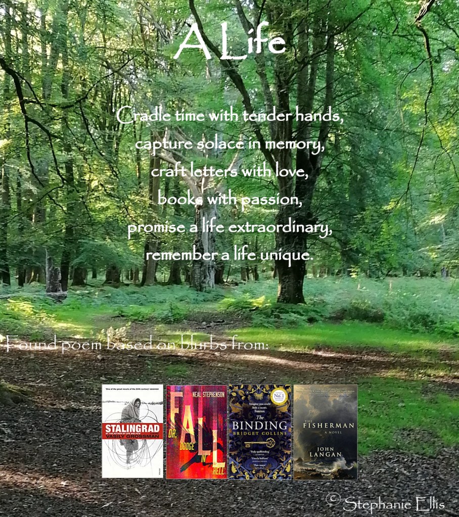 April is National Poetry Month and, never one for sitting back(!), I set myself a challenge of a poem every day. After the first day, I remembered a comment I made to Mike Arnzen last year when I created found poems based on some indie poets’ work. I said I was thinking of creating a found poem from the blurbs of books. Note this is the British context of the blurb being the description on the back of the book – not what I’ve come to realise is regarded as the comment made by another author about said work.
