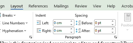 Why is this frustrating (and annoying) to editors and formatters? Because it has to be stripped out before styles can be applied and is time consuming. Find and Replace can only do so much and if you’re not careful, that can also screw up the layout, especially if soft returns are used. If spaces and soft returns, in particular, remain in a document and are not caught, they can do very odd things to the appearance of text on paper and, even more so, in an ebook.