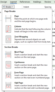 Position your cursor at the end of the last line of text before the new page or section and go to Layout/Breaks. For a new page, click on Page at the top of the list. For a new section, go to the lower half of the panel. The most common usage is Section Breaks, Next Page.